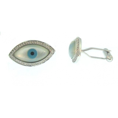 18Kt White Gold Mother Of Pearl, Turquoise, Onyx & Diamond Evil Eye Cufflinks (0.26cts tw)
